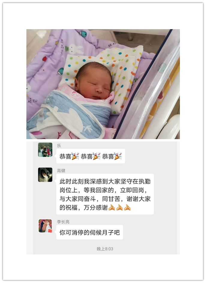 执行局辅警高健在朋友圈写到:2020年2月15日高子涵来报道,母子平安。同志们都祝福这个叫高子涵的孩子,在这特殊时刻平安的到来。可这时候,高健在工作群中主动请战:“此时此刻我深感大家坚守在执勤岗位上(的辛苦),等我回家,立即回岗,与大家同奋斗,同甘苦……”。新的生命带着希望降临,我们看到胜利并不遥远。