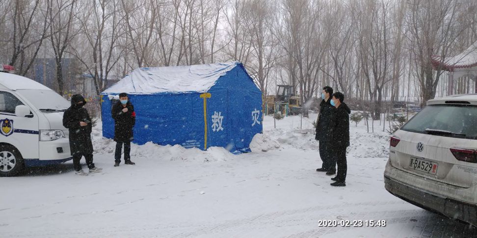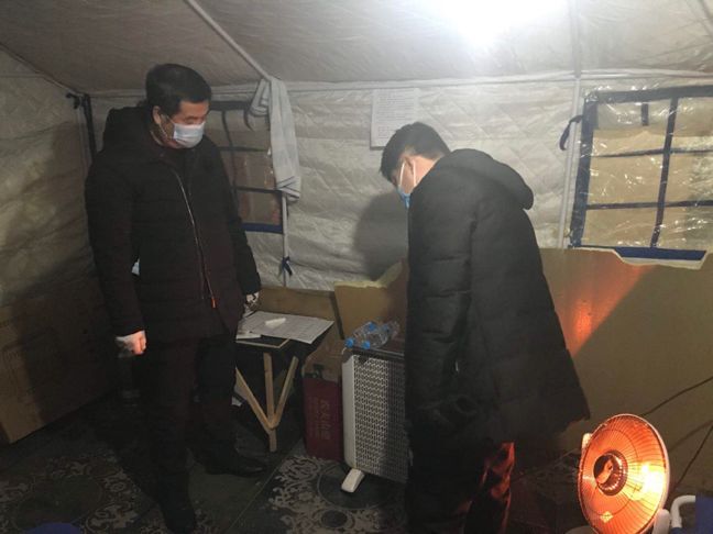 虽然天空飘起了小雪,但坚守在小区门口的干警仍不畏严寒,继续做好进出人员登记、重点人员排查等疫情防控工作,即使湿了鞋袜,脚底冰冷依然没有丝毫松懈。无论多大风雪,无论多少困难,依安县人民法院干警一直坚守在疫情防控一线。