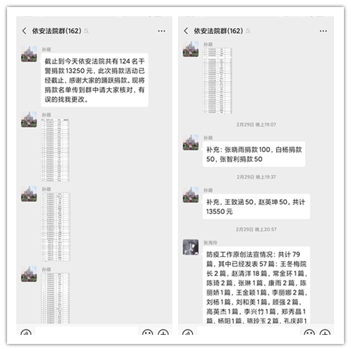 2月28日、29日,依安法院党员干警开展了自愿爱心捐款活动,为减少交叉感染,响应减少人群聚集的号召,捐款采用微信转账方式进行。活动中,院领导带头捐款,全体党员干警积极响应,以实际行动为抗击疫情贡献自己的一份爱心。值得一提的是在此次活动中依安法院的退休同志、普通干警、司法辅助人员、辅警谁都没落下。为期两天的捐款,共收到捐款13550元,其中退休老干部捐款650元,普通干警捐款5150元。面对新冠肺炎疫情大家守望相助,共渡难关。依安法院在完成好疫情防控包保工作任务和审判执行工作的同时,积极奉献,勇于担当,充分彰显了法院党员干警的社会责任担。春天马上就要来了,大家,一起加油!“感觉自己什么忙也帮不上,只能表达一点点心意。”来自退休的宫依梅副院长。“我们虽然不能在一线,但是希望能尽点绵薄之力,让大家吃点热乎的,睡得暖和点。”来自一位还在哺乳期的妈妈。“你好,请问我不是党员可以捐款吗?”来自一位普通干警。“不好意思昨晚值宿了才看到,我要捐款”来自一位已经奋战在一线20多天的司法辅助人员。