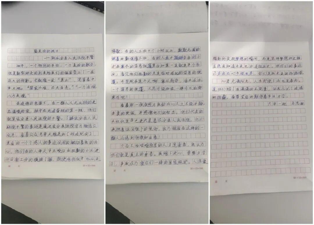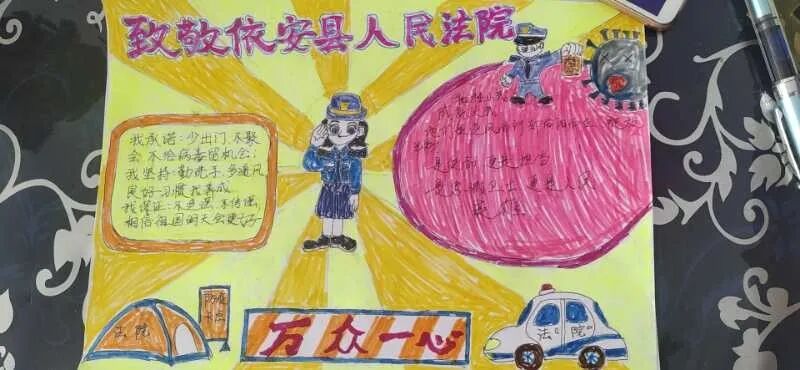 马思桐,一位读六年级的小朋友。过年期间他来依安串门,被疫情阻隔在依安法院干警负责管控的小区。他每天看到干警辛苦的值守,通过从家长手机上的微信公众平台了解到依安法院干警的感人事迹。马思桐为依安法院的干警画了一幅画,并创作了一篇题为《最美丽的战士--致依安县人民法院干警》的文章。孩子用稚嫩的画笔和纯洁的心灵对全院干警的赞誉,是我们在这个春天里被授予的“最暖心的荣誉”。