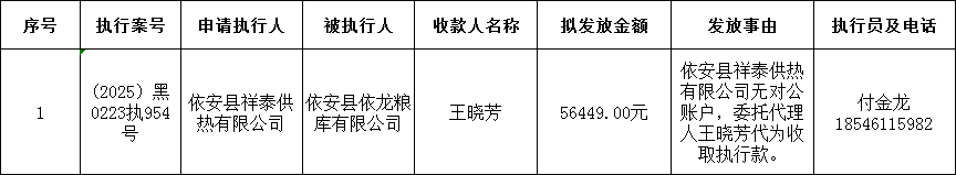 为进一步加强执行案款管理,规范执行案款发放程序,保障当事人合法权益,防范廉政风险,根据《最高人民法院关于执行款物管理工作的规定》等相关规定要求,现对以下案款发放事宜予以公示公示期为七个自然日(2025年11月10日至11月16日)。案件当事人或其他利害关系如有异议,应当在公示期内向执行人员提交书面意见及相关佐证材料。公示期满无异议的,本院将按照执行案款管理规定办理案款发放。