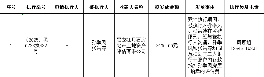 为进一步加强执行案款管理,规范执行案款发放程序,保障当事人合法权益,防范廉政风险,根据《最高人民法院关于执行款物管理工作的规定》等相关规定要求,现对以下案款发放事宜予以公示公示期为七个自然日(2026年1月26日至2026年2月1日)。案件当事人或其他利害关系如有异议,应当在公示期内向执行人员提交书面意见及相关佐证材料。公示期满无异议的,本院将按照执行案款管理规定办理案款发放。