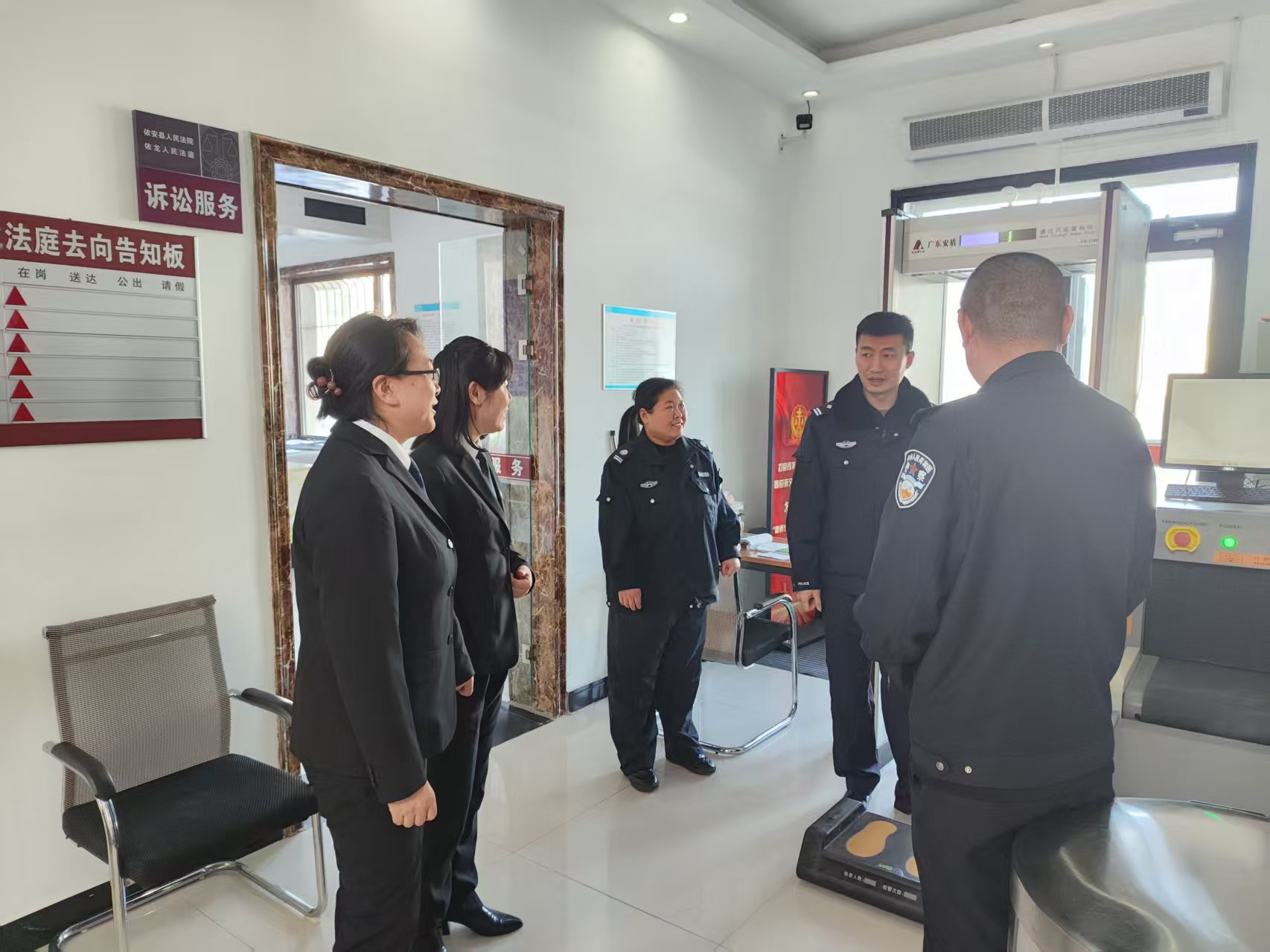本次检查紧扣安全工作特点,重点对安检通道、诉讼服务大厅、审判庭、消防设施区等关键风险点,采取“实地察看、现场测试、台账核查、实操检验”的方式,全方位排查安全隐患。在安检区域,朱庆哲队长现场查验安检设备运行状况,要求安保人员严格执行安检流程,对易燃易爆、管制刀具等危险物品实行“零容忍”,坚决防范无关人员携带危险物品进入诉讼场所。针对检查中发现的安全隐患和薄弱环节,要求法庭立即整改,全力防范化解各类安全风险,为执法办案筑牢安全屏障。