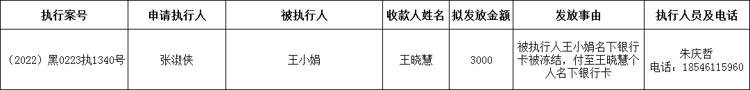 为进一步加强执行案款管理,规范执行案款发放程序,保障当事人合法权益,防范廉政风险,根据《最高人民法院关于执行款物管理工作的规定》等相关规定要求,现对以下案款发放事宜予以公示公示期为七个自然日(2025年6月12日至2025年6月19日)。案件当事人或其他利害关系如有异议,应当在公示期内向执行人员提交书面意见及相关佐证材料。公示期满无异议的,本院将按照执行案款管理规定办理案款发放。